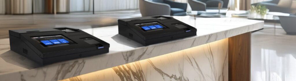 アルメックスのKIOSKは、医療・宿泊など“受付/精算”の現場に強いブランドとして知られ、ホテルでも導入検討に挙がりやすい機種です。自立型の筐体で視認性が高く、ロビーに置いても存在感があり、利用を促しやすいのが特徴。