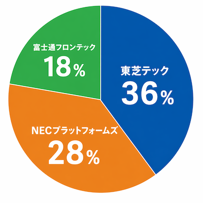 特に国内では、東芝テック・NECプラットフォームズ・富士通フロンテックの3社で約8割のシェアを占める寡占構造となっており、安定性やサポート体制が重視されています。