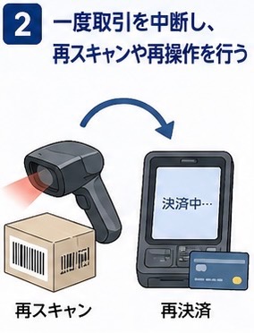 一時的なエラーの場合は、取引を中断して再度操作を行うことで解消するケースがあります。商品を再度スキャンし直す、決済をやり直すなど、基本的な操作を丁寧に行うことが重要です。