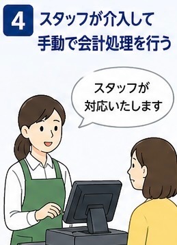 エラーが解消しない場合は、スタッフが介入して手動で会計処理を行う必要があります。セミセルフレジであればスタッフ側の操作で対応できる場合もあり、フルセルフレジでも管理画面や別レジでの対応が可能です。