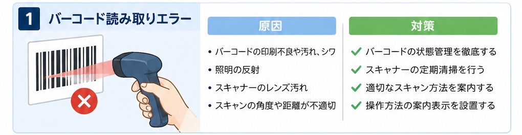 また、商品をスキャンする角度や距離が適切でない場合も読み取りに失敗しやすくなります。対策としては、バーコードの状態管理やスキャナーの定期清掃、操作方法の案内表示の設置などが有効です。