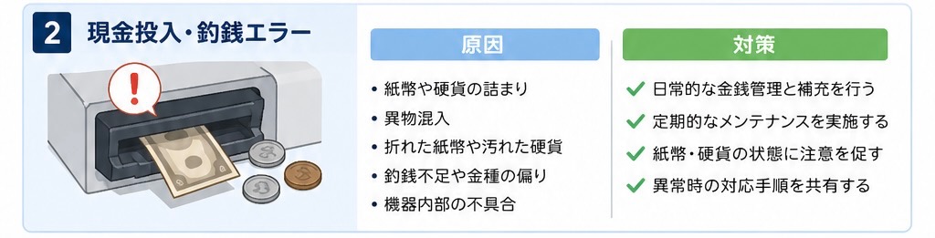 また、釣銭不足や金種の偏りによってもトラブルが発生することがあります。対策としては、日常的な金銭管理と補充、定期メンテナンス、異常時の対応手順をスタッフに共有しておくことが重要です。