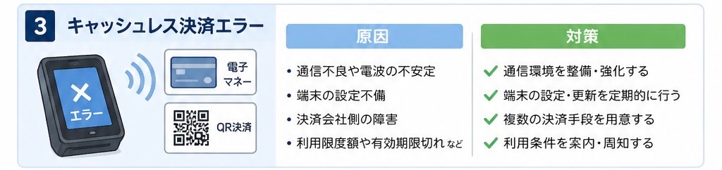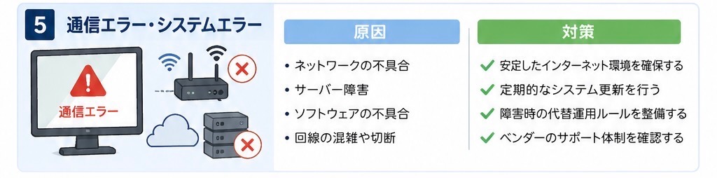 これらのエラーが発生すると、決済や売上処理が停止し、営業に大きな影響を与える可能性があります。対策としては、安定したインターネット環境の確保、定期的なシステム更新、障害時の代替運用ルールの整備が重要です。