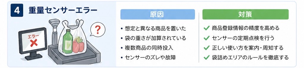 重量センサーエラーは、商品を袋詰めエリアに置いた際の重量がシステム上の登録情報と一致しない場合に発生します。想定と異なる商品を置いた場合や、袋の重さ、複数商品の同時投入などが原因です。
