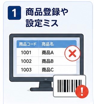 商品マスタの登録ミスや設定不備は、セルフレジのエラー原因としてよく見られます。例えば、バーコードと商品情報が一致していない場合や、重量センサー用のデータが正しく設定されていない場合、正常に読み取れずエラーが発生します。